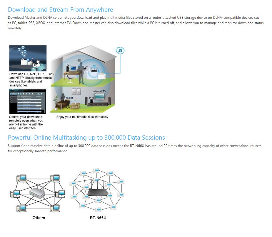| Features | Airtime Fairness | SmartQoS | WMM | User definable rules for IP/MAC/Port | Upload and download bandwidth management | ACK/SYN/FIN/RST/ICMP with highest priority | Guest Network : 2.4 GHz x 3, 5 GHz x 3 | VPN server : IPSec Pass-Through, PPTP Pass-Through, L2TP Pass-Through, PPTP Server | VPN client : PPTP client, L2TP client, OpenVPN client | Enhanced media server | Image : Jpeg | Audio : mp3, wma, wav, pcm, mp4, lpcm, ogg | Video : asf, avi, divx, mpeg, mpg, ts, vob, wmv, mkv, mov | AiCloud personal cloud service | 3G/4G data sharing | Printer Server | Multifunctional printer support (Windows only) | LPR protocol support | Download Master | Support bt, nzb, http, ed2k | Support encryption, DHT, PEX and magnet link | Upload and download bandwidth control | Download scheduling | AiDisk file server | Samba and FTP server with account management | Dual WAN | IPTV support |